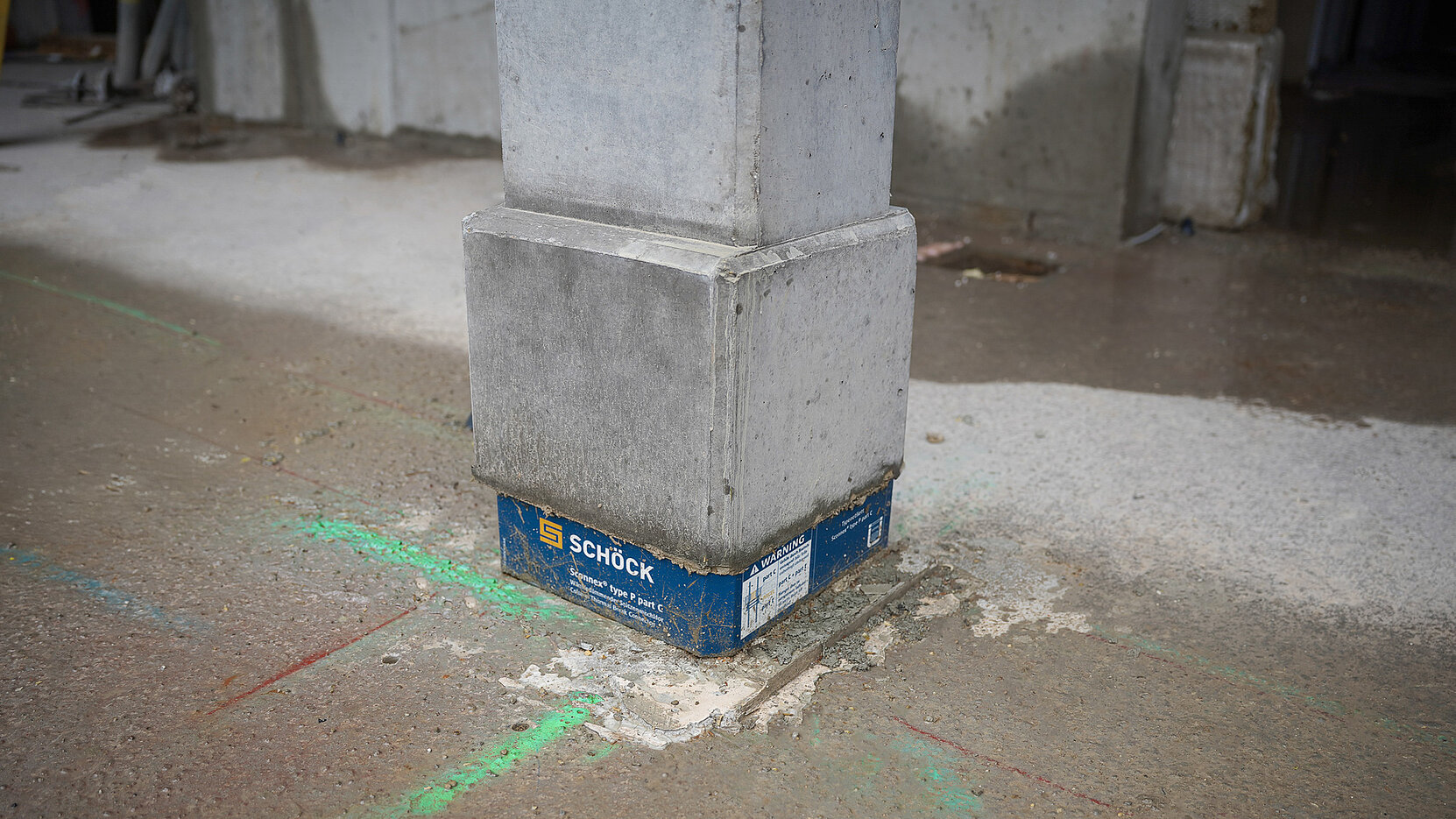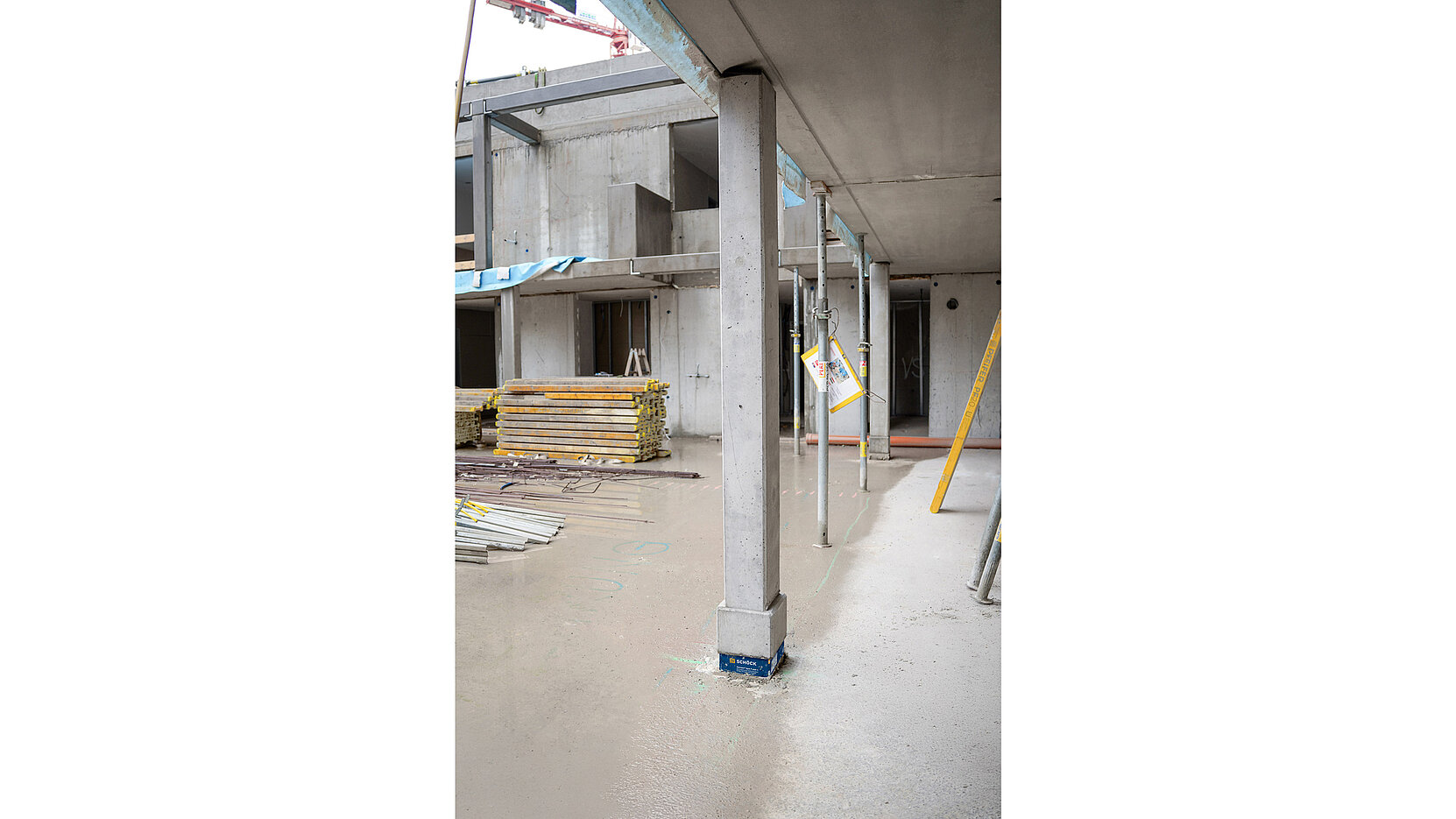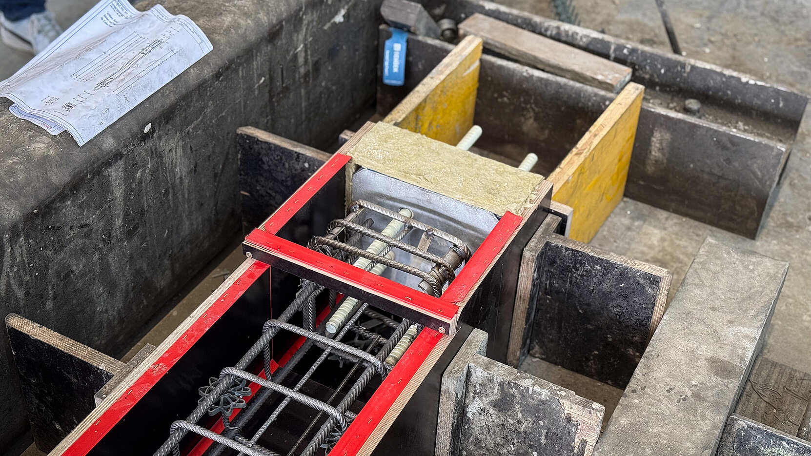 Einen wesentlichen Beitrag zur Realisierung des Projekts leistet die Firma Schöck mit ihren Lösungen nach dem TELLIGENT® Prinzip. Dieses unterstützt nicht nur eine besonders wirtschaftliche Bauweise und trägt somit direkt zur Schaffung von leistbarem Wohnraum bei, sondern fördert zugleich ein nachhaltiges und energieeffizientes Bauen. Konkret wurde bei diesem Bauvorhaben die Effizienz des Bauprozesses maßgeblich gesteigert: Die tragenden Säulen wurden bereits im Fertigteilwerk mit dem thermisch trennenden Bauteil Schöck Sconnex® P-U ausgestattet. Diese montagefertigen Elemente wurden direkt zur Baustelle geliefert und dort präzise und zeitsparend in den vorab betonierten Stützenfuß eingesetzt. Dieser hohe Grad an Vorfertigung beschleunigt nicht nur den Bauablauf erheblich, sondern sichert auch eine durchgängig hohe Qualität und minimiert Wärmebrücken – ein entscheidender Faktor für die Energieeffizienz des gesamten Gebäudes.