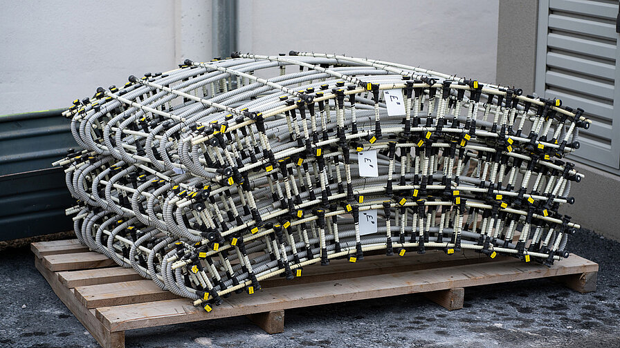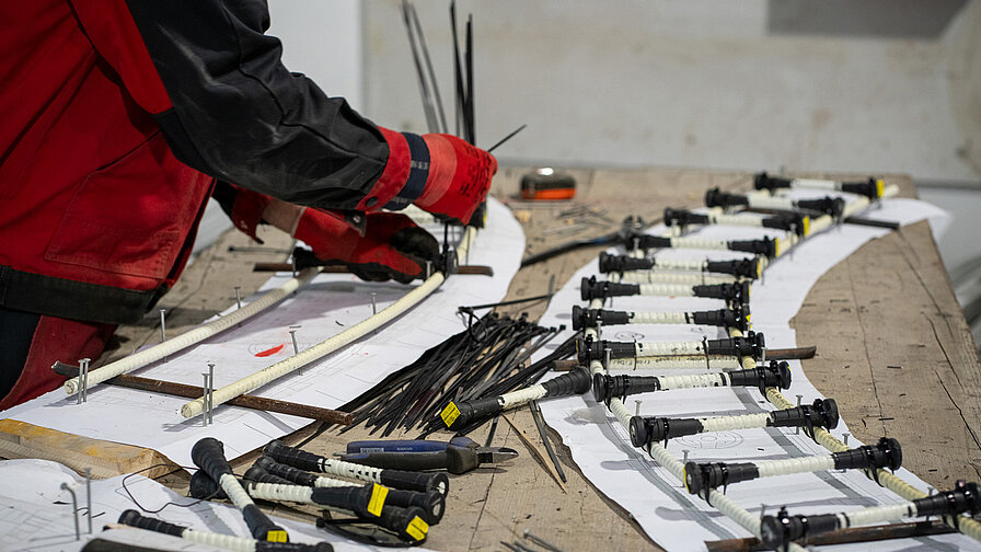 Die fertigen Körbe wurden im weiteren Produktionsverlauf in die Schalungsvorrichtung eingelegt, in die anschließend der Beton eingebracht wurde.