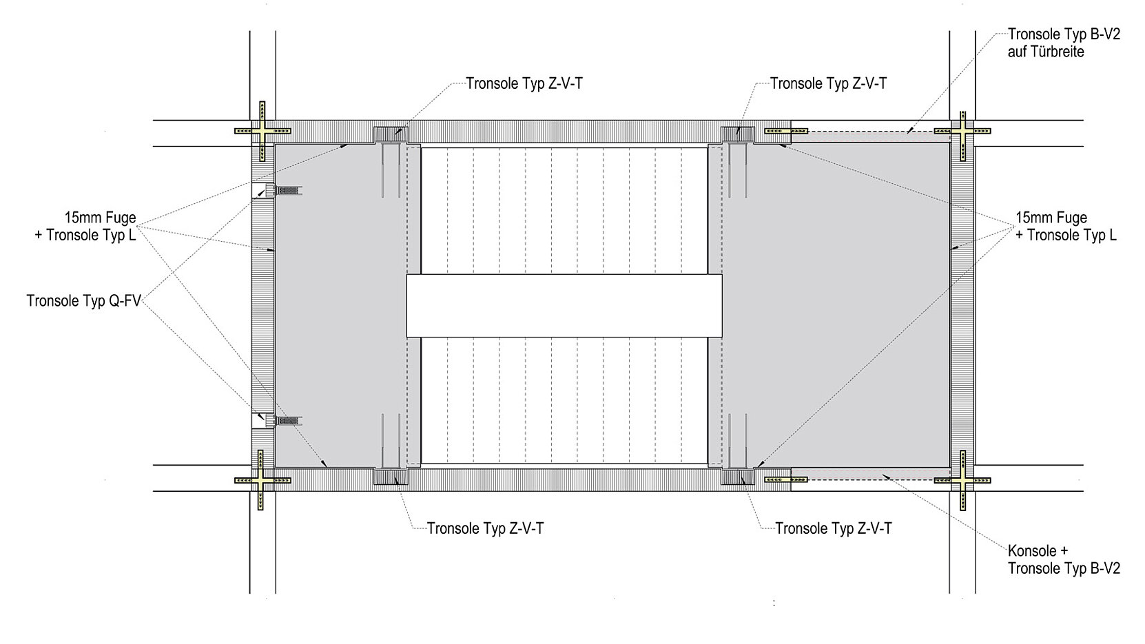 In der rückwärtigen Wand wurden zwei Trittschalldämmelemente vom Typ Q eingebaut. In den seitlichen Wänden kam Tronsole Typ Z zum Einsatz. Beim Hauptpodest wurden an der Vorderseite jeweils zwei Tronsole Typ Z sowie längs auf der Treppenhauswand zwei Tronsole Typ B eingebaut.