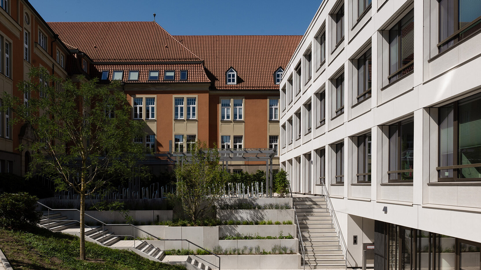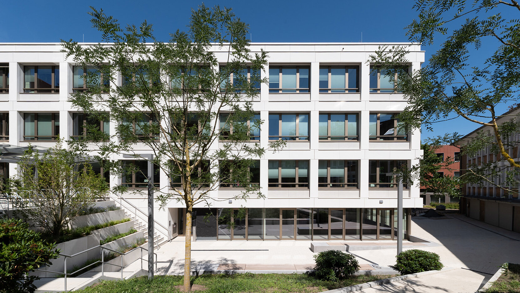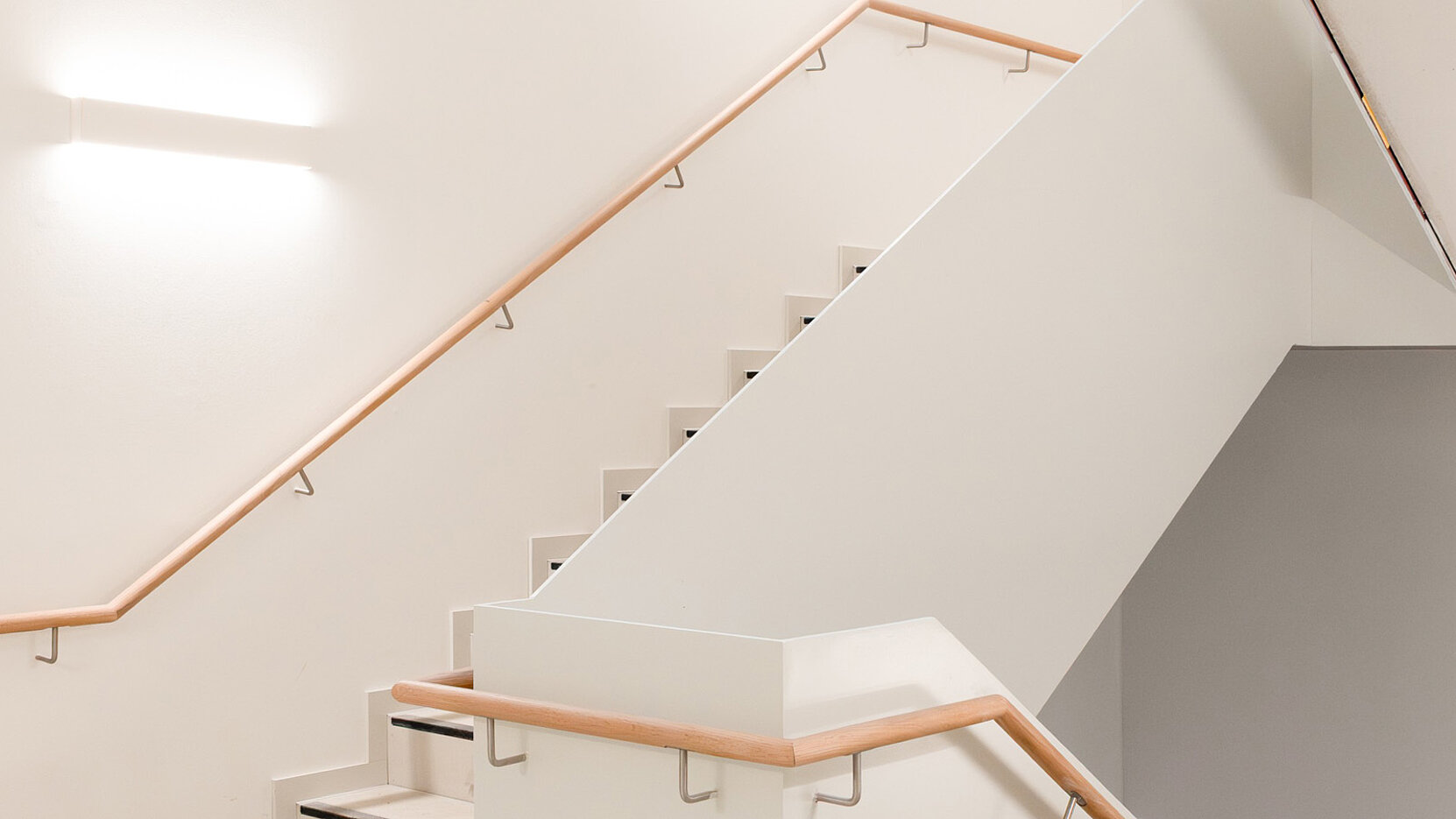 Das Fluchttreppenhaus nach Fertigstellung: Das Zusammenspiel aus klassisch grauem Sichtbeton, Holzhandläufen sowie filigranen weißen Brüstungsblechen im Treppenauge sorgt für eine hochwertige Anmutung.