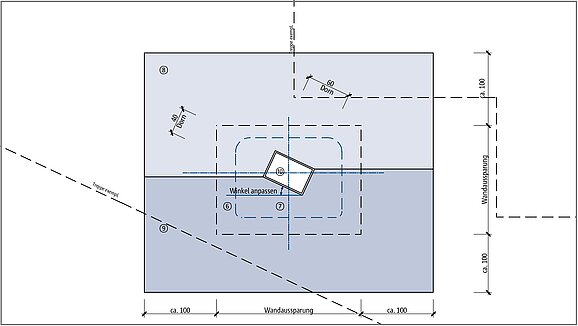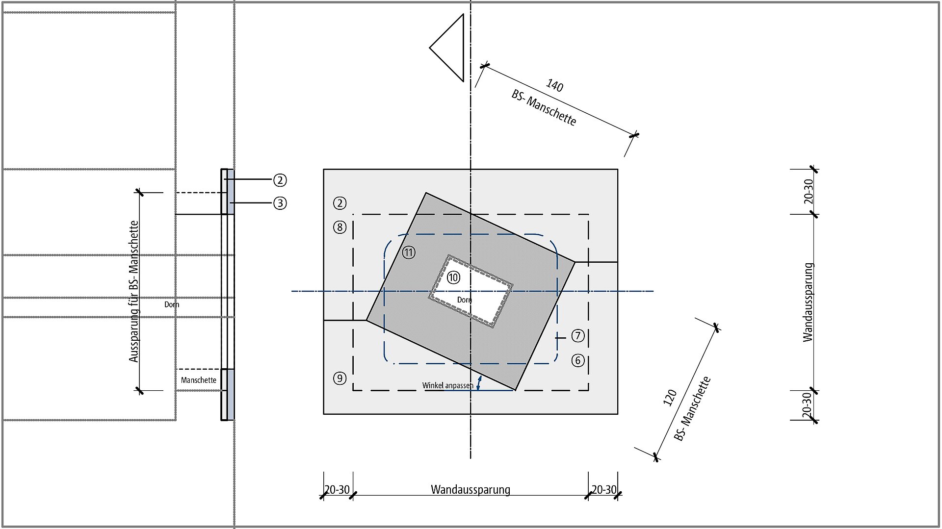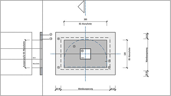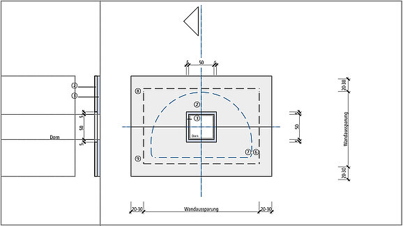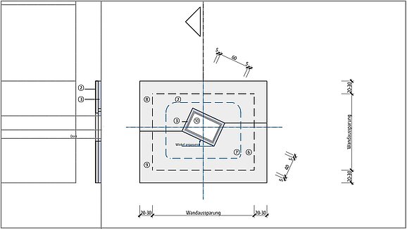 - Dabei ist bei der Gestaltung und Anbringung der Verkleidung der Wandaussparung auf eine schallbrückenfreie Ausführung zu achten. Dies kann durch eine elastische Fuge zum Tragelement sowie durch einen Dämmstoff zur Wandaussparung gewährleistet werden.