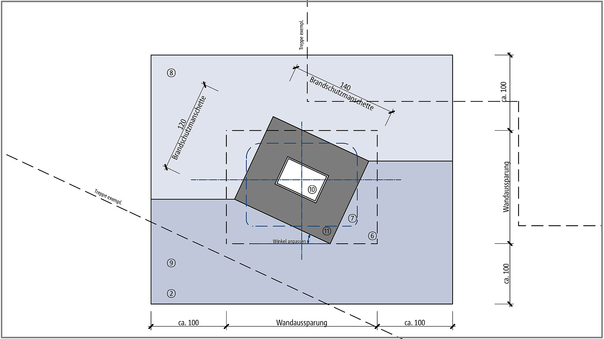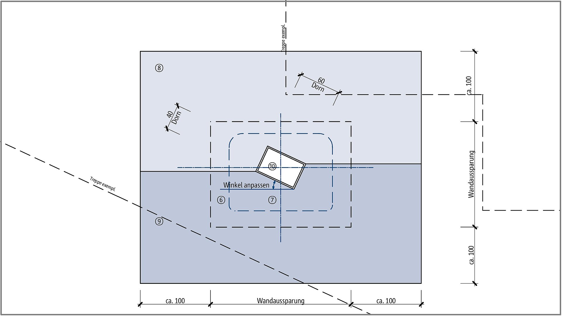 - Wie eine Verkleidung der Wandaussparung aussehen und der Einsatz im Treppenhaus erfolgen kann, ist den nachfolgenden Zeichnungen beispielhaft zu entnehmen.