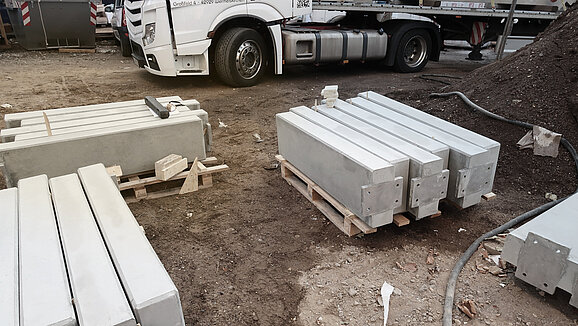 - In nachfolgenden Abbildungen sind die bereits montierten Einzelstufen, die zugehörigen Einbauteile für die Stahlbetonwand sowie die Fertigteilstufen mit bereits integrierten Einbauteilen abgebildet.