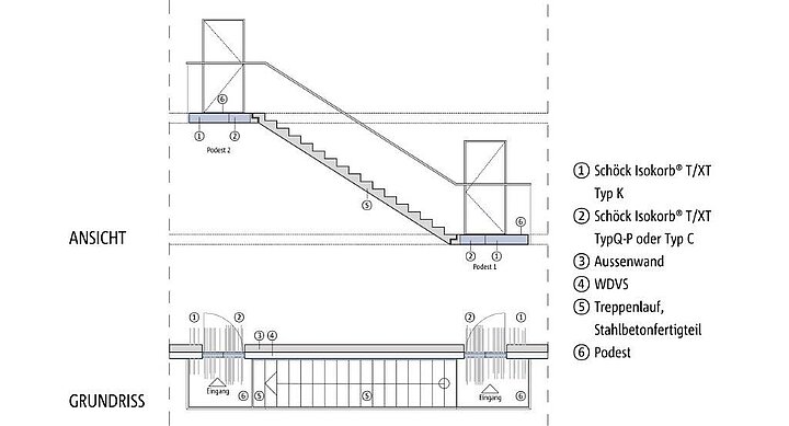 - Ein thermisch entkoppelter Anschluss von Treppen im Außenbereich lässt sich über das tragende Wärmedämmelement Schöck Isokorb® realisieren.
