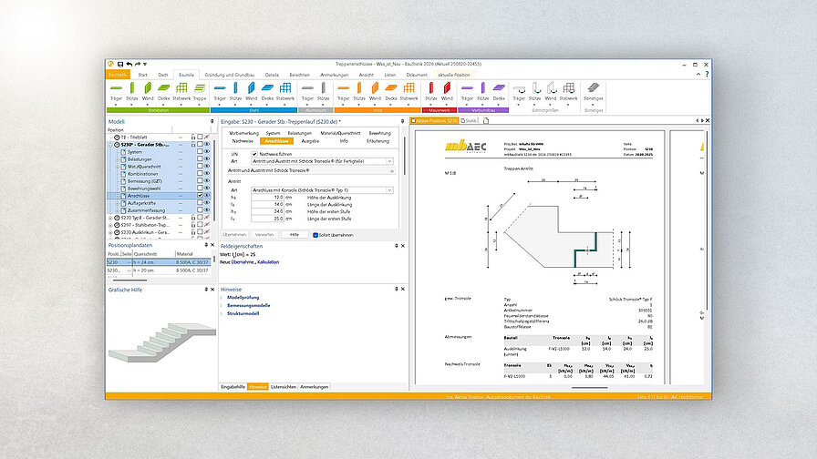 Mit dem aktuellen Release der mb AEC Kundensoftware erweitert sich der Funktionsumfang für die Bemessung von Treppenläufen aus Stahlbeton. Ab sofort können Anwender Schöck Tronsole® Typ F und Typ B direkt im BauStatik Modul S230.de auswählen und bemessen – voll integriert, zulassungsgerecht und mit stets aktuellen Produktdaten von Schöck.