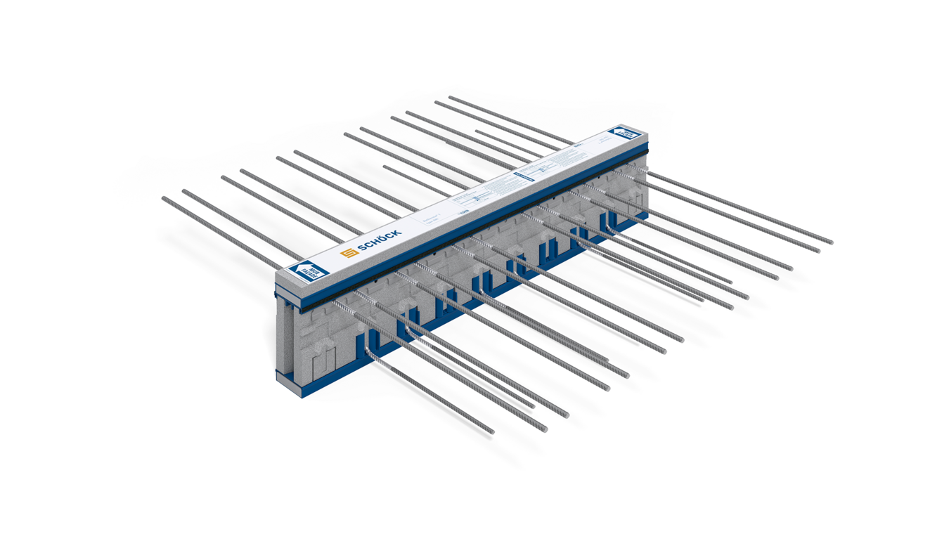 Rupteur de ponts thermiques pour la liaison entre la dalle intérieure coulée sur place et le balcon, en isolation intérieure. L'élément reprend les moments fléchissants et les efforts tranchants du balcon et de la dalle intérieure.